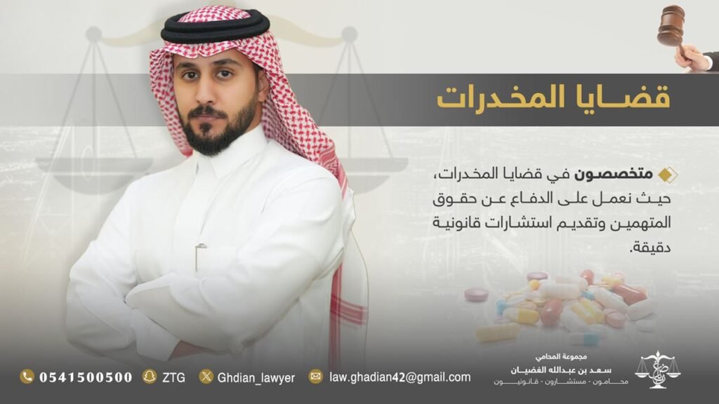 مجموعة المحامي سعد بن عبدالله الغضيان للمحاماة هو الوجهة المثلى للدفاع عن المتهمين في قضايا المخدرات في المملكة العربية السعودية. يتميز المكتب بفريق من المحامين المتخصصين ذوي الخبرة العالية في التعامل مع أصعب وأعقد القضايا الجنائية المتعلقة بالمخدرات. بفضل معرفتهم الدقيقة بالقوانين والتشريعات السعودية وقدرتهم على تقديم دفاع قوي واستراتيجيات قانونية مبتكرة، يضمن مكتب سعد الغضيان تقديم أفضل الحلول القانونية التي تحمي حقوق موكليهم وتحقق العدالة. سواء كنت تواجه اتهامات تتعلق بحيازة أو تجارة المخدرات، فإن مكتب سعد الغضيان سيقف بجانبك بكل احترافية لضمان الحصول على أفضل النتائج الممكنة.